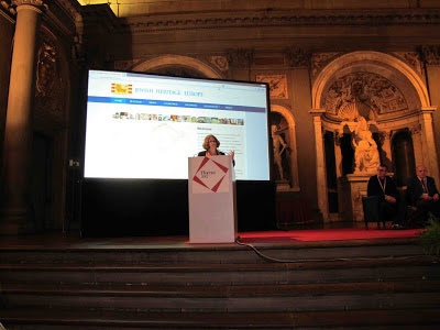 For my talk, I had an internet connection projected on two immense screens. I presented Jewish Heritage Europe as a tool that is already functional, attracting 4,000-5,000 people a month. I took the audience on a tour of the site, describing both the static content for 48 countries — and also the dynamic content — the newsfeed, calendar, and the In Focus section.